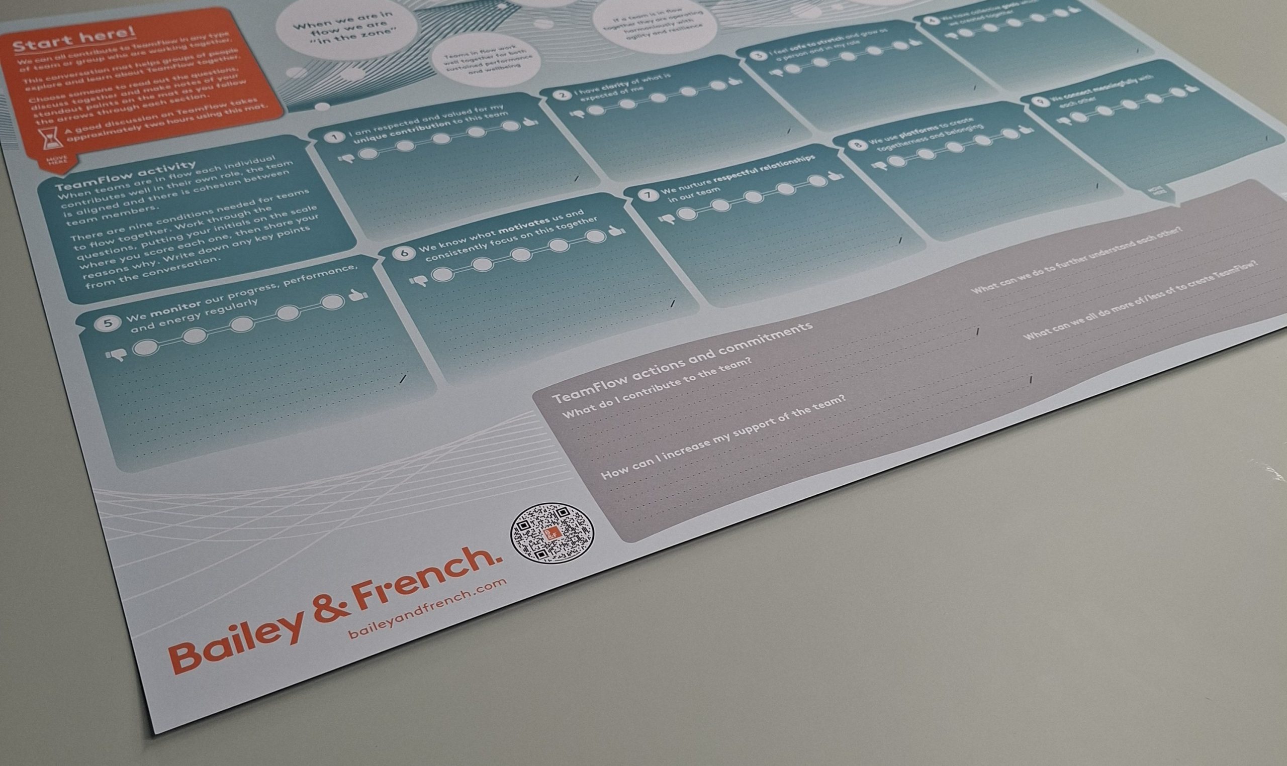 The TeamFlow Mat helps teams explore what makes collaboration seamless and effective. It opens up conversations about trust, rhythm and shared momentum, highlighting the conditions that enable people to do their best work. Through guided discussions, teams gain a clearer understanding of both the strengths they bring and the barriers that might disrupt their flow, creating practical insights for improving team performance.